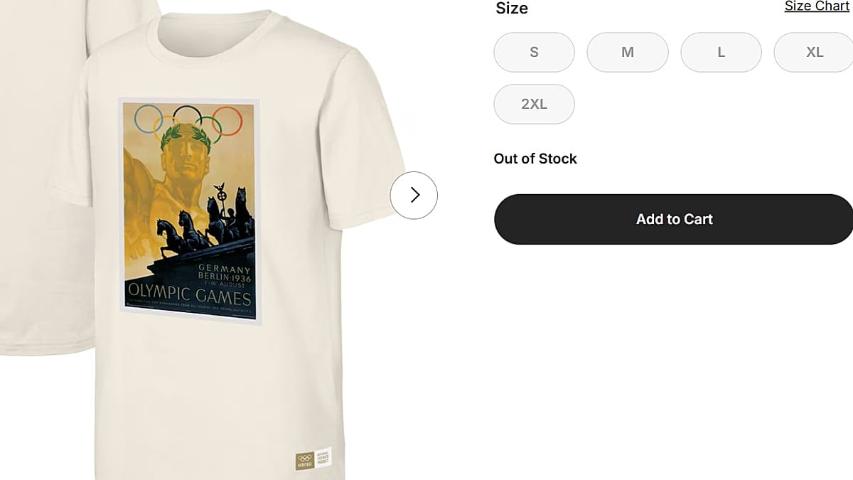 Das Herren-T-Shirt „Natural 1936 Berlin Games Olympic Heritage T-Shirt“ ist im Online-Shop der Olympischen Spiele ausverkauft. Es stand im Online-Shop für 39 Euro und hat Kontroversen ausgelöst, nachdem Fans den Verkauf von Merchandise im Zusammenhang mit dem, was als die „Nazi-Spiele“ bezeichnet wird, kritisiert hatten.